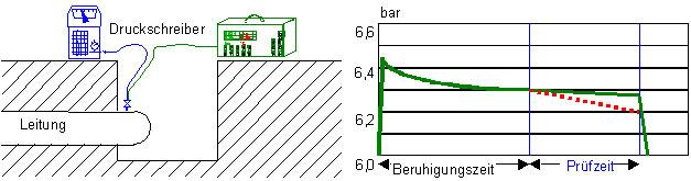 Die Leitung wird auf Prüfdruck gebracht und sollte möglichst vollständig verfüllt sein. Als Temperaturanpassungszeit gilt mindestens 1 h/bar. Dann erfolgt der Ablasstest mit anschließender Dichtheitsprüfung. Es wird empfohlen, die Präzisionsdruckmessverfahren mit elektronischem Druck- und Temperaturaufnehmer für die Dauermessung und eine jeweils 1-stündige Druckdifferenzmessung oder Direktdruckmessung mit Kolbenmanometer am Beginn und am Ende der Prüfung zu kombinieren. Dadurch erreicht man eine gegenseitige Kontrolle der beiden Messtechniken. Man behält einerseits die Messgenauigkeit durch das Kolbenmanometer bei, generiert jedoch anderer-seits die Zeiteinsparung durch die automatisierte Daueraufzeichnung von Druck und Temperaturen mit der elektronischen Messtechnik.