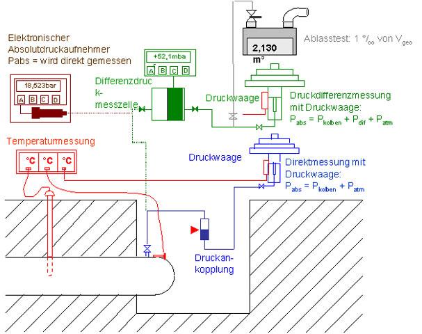- Verfahrensart 1: Direktdruckmessung mit Kolbenmanometer. Der absolute Leitungsdruck ergibt sich aus der Summe aus Plattendruck und Luftdruck. Wichtig hierbei ist die Konstanthaltung der Luft/Ölankopplung über ein Schauglas und die Temperaturkompensation des Kolbenmanometers über Temperaturmessung am Kolben.