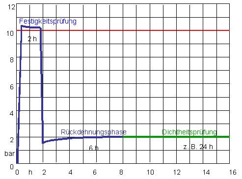 Bei Kunststoffleitungen zeigt sich bei einem Prüfdruck über 10 bar ein nicht mehr in 24 h vollständig abklingendes viskoelastisches Ausdehnungsverhalten, das die Druckprüfung störend beeinflusst. Es wurde deshalb festgelegt, für Hochdruckleitungen aus Kunststoff über DP 5 die Festigkeits- von der Dichtheitsprüfung zu trennen. Die Leitung ist unbedingt mit einem Kompressor mit Vorkühlung aufzupumpen, ansonsten könnte der Werkstoff in den ersten Metern Schaden erleiden. Die Festigkeitsprüfung wird über ein einmaliges Aufbringen des Prüfdrucks über 2 h durchgeführt. Nach dem Absenken des Prüfdrucks ist ein 6-stündiges Abklingen der Kontraktion abzuwarten, um dann die Dichtheitsprüfung mit einem Überdruck von ca. 2 bar durchzuführen (Abbildung 5).