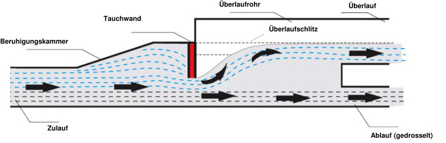Sehr häufig lassen sich jedoch bestehende Strukturen nur schwer oder überhaupt nicht auflösen und so werden im Hinblick auf den erforderlichen Gewässerschutz weiterhin kombinierte Überlaufbauwerke geplant und errichtet. Diese sollen z.B. in Verbindung mit Stauraumkanälen, Regenrückhaltebecken und Drosseleinrichtungen dafür sorgen, dass eine von der Kläranlage maximal hydraulisch beherrschbare Abwassermenge tatsächlich in die Kläranlage gelangt. Das übrige Mischwasser wird bis zu einem behördlich festgelegten Volumen gespeichert. Der verbleibende Rest soll weitgehend von Schmutzfracht befreit dem Vorfluter zugeführt werden.