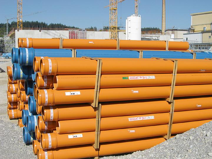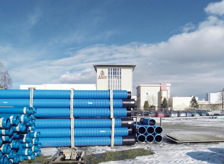 Auch beim Kanalbau zur Schmutzwasserableitung in die firmeneigene biologische Kläranlage setzte das planende Ingenieurbüro für Bauwesen in Biessenhofen auf die Technologie und das Know-how des Unternehmens. So fiel hier die Wahl auf das Hochlast-Kanalrohrsystem AWADUKT PP SN16 RAUSISTO.