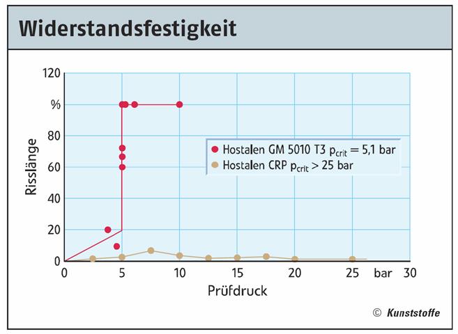 Die Produktion von bimodalen Rohrwerkstoffen hat Basell vor knapp 10 Jahren am Standort Frankfurt aufgenommen. Dazu zählt neben Hostalen CRP 100 Black und Blue auch Hostalen GM 5010 T3 Black, ein PE-HD der Leistungsklasse PE 80. Dieses Material zeichnet sich ebenfalls durch hohe Zähigkeit, Spannungsrissbeständigkeit und Kerbunempfindlichkeit aus.