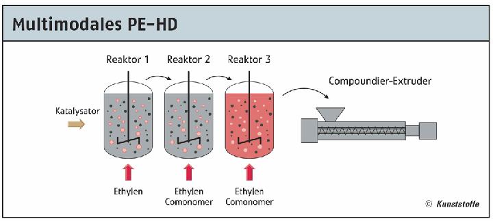 Beim ACP-Verfahren laufen in hintereinander geschalteten Reaktoren spezifische Teilprozesse ab (Bild 5) und ergeben multimodales PE-HD [5]. Diese Kaskadentechnik ermöglicht es, die für die Fertigteileigenschaften wichtigen Comonomere noch effektiver und gezielter als bisher in die hochmolekulare Fraktion einzubauen [4].