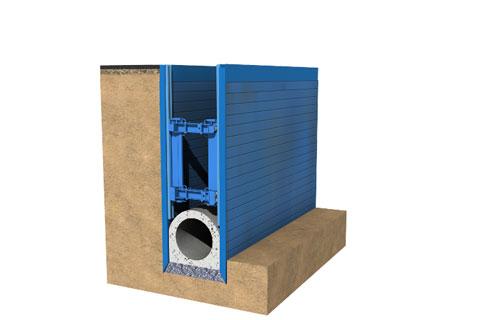 - Entwicklung eines Linearverbausystems mit vertikal verlaufenden Kanälen in den Verbauplatten, durch die ein fließfähiges Verfüllmaterial in den Zwischenraum zwischen Rohraußenwand und Verbau eingeleitet werden kann (Emunds+Staudinger GmbH, Hückelhoven).