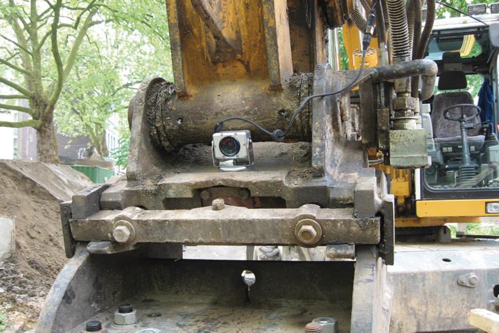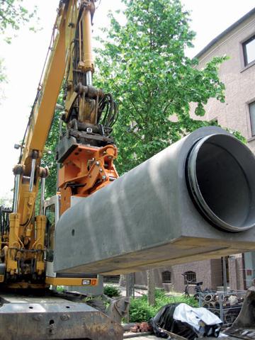 Als zweites Kernelement wurde - als Anbaugerät für den Bagger – ein Verlegegerät entwickelt. Hiermit kann der Baggerfahrer das Rohr aufnehmen, in den verfahrensbedingt sehr schmal verbauten Rohgraben einfädeln und mit dem vorher verlegten Rohr zusammenschieben.