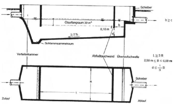 Zur Regen- und Mischwasserbehandlung sind in den vergangenen Dekaden etliche Becken gebaut worden, die die Gewässer vor übermäßigem Schmutzeintrag schützen sollen. Diese Becken wirken vorwiegend durch Sedimentation partikulärer Stoffe und halten, mit Tauchwänden ausgerüstet, auch aufschwimmbare Stoffe – insbesondere Leichtflüssigkeiten wie Kraftstoffe und Öle – zurück. Für die Straßenentwässerung werden in Wasserschutzgebieten häufig Abscheider für Leichtflüssigkeiten eingesetzt. Die meisten bestehenden Anlagen sind nach den „Richtlinien für bautechnische Maßnahmen an Straßen in Wassergewinnungsgebieten“ RiStWag [1, 2] geplant und bebaut worden (Abbildung 1) und werden im Dauerstau betrieben.