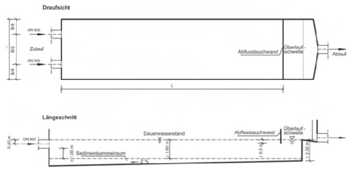 - Anordnung der Zulaufrohre mit Rohrscheitel unterhalb des Dauerwasserspiegels zur Vermeidung vertikaler Strömungen,
