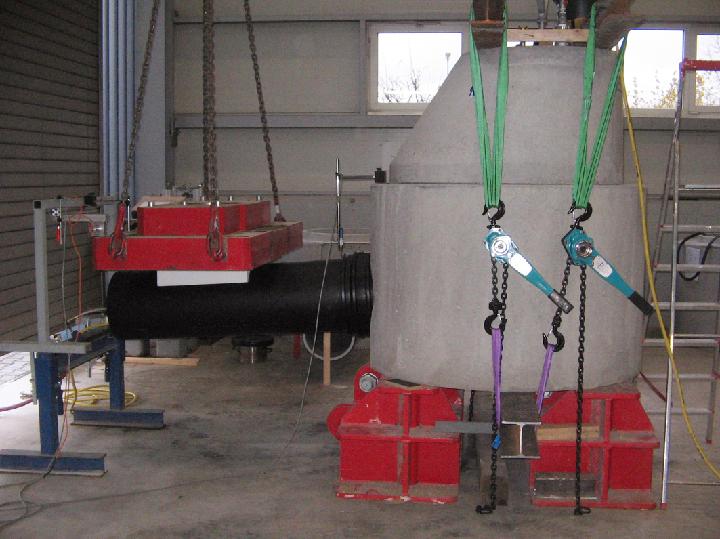Nach dem oberirdischen Zusammenbau von Rohr und Schacht winkelten die IKT-Forscher das Rohr schrittweise um 13 mm/m bis 34 mm/m bzw. 0,7° bis 1,9° ab. Durch Gewichte, die über Styroporkissen die Rohroberseite belasteten, wurde die jeweilige Abwinklungsstufe eingestellt und mit Hilfe entsprechender Wegaufnehmer kontrolliert.