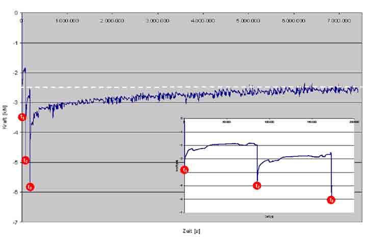 Während der gesamten Versuchsdauer hat eine Kraftmessdose die Rückstellkraft am Rohrende des angeschlossenen PE-Rohres kontinuierlich aufgenommen. Die Rückstellkraft nimmt unmittelbar nach dem Erreichen der jeweiligen Abwinklungsstufe exponentiell ab. Nach der dritten Abwinklungsstufe nähert sich der Verlauf der Kraft über den Prüfzeitraum von drei Monaten asymptotisch dem Wert der Kraft an, der unmittelbar vor dem Aufbringen der dritten Abwinklungsstufe vorlag. Erwartungsgemäß relaxiert das eingesetzte Material. Das heißt, die im PE-Rohr unter der aufgezwungenen Verformung entstandene Spannung hat zeitabhängig abgenommen.