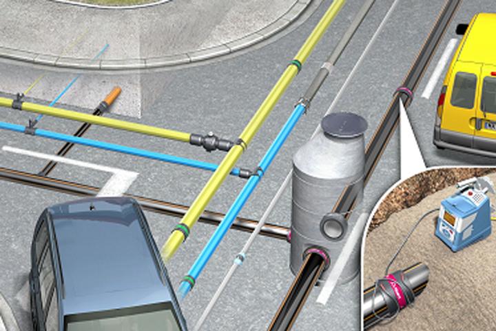 Ebenso ermöglicht die hohe Elastizität des Werkstoffes, zusammen mit der längskraftschlüssigen Heizwendelschweißverbindung die Verwendung in Erdsenkungsgebieten.Heizwendelschweißmuffe