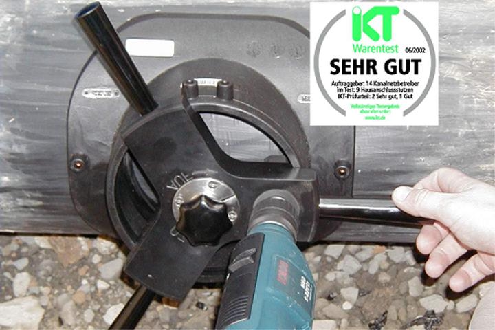 Die Montage in das Schachtfutter erfolgt auf der Gegenseite der AEM durch Einschieben. Für die Abdichtung sorgen zwei elastomere Dichtringe. Zusätzliche Sicherheit bietet ein dritter, wasserquellfähiger Dichtring: Durch Wasserkontakt kann sich das Volumen des Sonderdichtrings um das bis zu Zehnfache vergrößern und schottet damit sicher den Schachtanschluss zum umgebenden Erdreich ab.Der Abwassersattel ASA-TL stellt eine technisch intelligente und wirtschaftliche Lösung für die Einbindung von Hausanschlüssen an PE-Kanalleitungen dar. Der Systemgedanke des rundum dichten Systems durch homogene Materialverbindung wird dabei konsequent fortgeführt. Bild 10 zeigt den Anbohrvorgang des Sammlers.