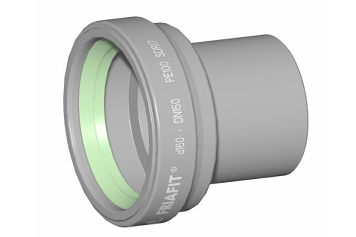 In der Regel wird das PE-Kanalrohr in der Dimensionierung SDR17,6 ausgelegt und erfüllt mit dieser gewählten Wanddicke die statischen Anforderungen. Bei geringeren Belastungen ist auch der Einsatz von dünnwandigen Rohren SDR33 möglich, bei hohen Anforderungen das dickwandige Rohr SDR11 und kleiner. Für ein PE-System sind neben dem Rohr geeignete Ver- und Anbindungsformstücke erforderlich. Das FRIAFIT®-Abwassersystem (Bild 7) besteht aus einer speziellen Einbindung an Betonschächte, der Heizwendelschweißmuffe, dem Hausanschlussaufschweißsattel sowie einer Vielzahl von Formstücken, z. B. Bögen und Reduzierungen sowie Übergangsstücke für Rohre aus anderen Werkstoffen. Für die Verarbeitung stehen neben dem Schweißgerät auch Schälgeräte, Rundungsschellen und weiteres Zubehör zur Verfügung. Für eine einfache Montage empfehlen sich Rohre mit eingeschränkter Durchmessertoleranz nach DIN 8074, bzw. DIN EN 13244-2. Die Rohre sollten entsprechend den Herstellerangaben so gelagert werden, dass keine Verformung eintritt.