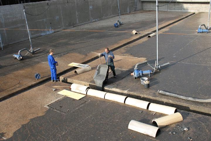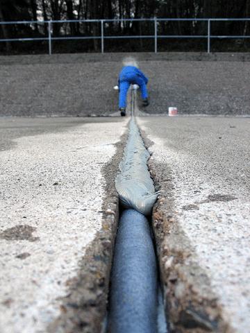 Die rund 700 Meter Fugen in den beiden Bauwerken wurden durchwegs nach dem gleichen Muster saniert. Im ersten Arbeitsgang wurden Fugenreste entfernt und die entleerten Fugen durch Hochdruck-Wasserstrahl gereinigt. Ausgebrochene Fugenkanten wurden aufprofiliert, bevor man die Fugenwandungen mit einem Primer behandelte. Durch Einlegen eines Poly-Fugenbandes in die Fuge stellte man sicher, dass das später verpresste Fugen-Dichtmaterial keine dreiseitige Haftung zum Beton einging - eine wesentliche Voraussetzung für die Elastizität der Fuge. Zugleich definiert das Poly-Fugenband die eigentliche, mit Dichtmaterial zu füllende Fugentiefe. Auf das liegende Fugenband verpresste man aus einer Kartusche heraus einen dauerelastischen Dichtstoff auf Polyurethan-Basis.