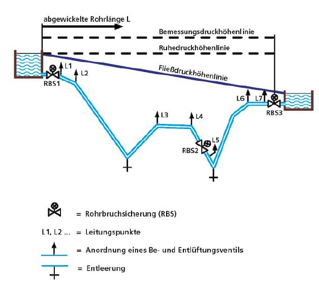Zur Absicherung der Rohrleitung gegen unzulässige Druckschwankungen für einen störungsfreien Betrieb ist je nach Betriebszustand eine Belüftung oder Entlüftung der Leitungsanlage erforderlich. Die in Leitungen eingeschlossenen Gasblasen (Luft, Kohlensäure usw.) verringern den freien Strömungsquerschnitt, erhöhen den Druckverlust in der Leitung und erzeugen unter Umständen unerwünschte Druckstöße.