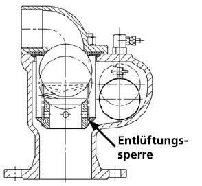 | Rechts: | Die Darstellung zeigt eine Betriebsentlüftung. Der Schwimmkörper ist an einem Hebel befestigt. Ein Ventilstößel am Hebel verschließt die Entlüftungsbohrung bei positivem Druck. Bei negativem Druck sinkt der Schwimmkörper ab und die Bohrung wird geöffnet. Luft kann entweichen. |
