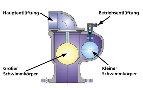 Sobald das Betriebsmedium beim Befüllen den großen Schwimmkörper der Hauptentlüftung erreicht, wird er angehoben und bleibt unter Druck immer geschlossen. Kleinere Luftvolumina, die während des Normalbetriebs entstehen können, werden über die Betriebsentlüftung abgeführt. Der kleinere Schwimmkörper wird dann vom Betriebsmedium angehoben und verschließt die Düse der Betriebsentlüftung. Er öffnet immer dann, wenn sich im Gehäuse während des Betriebes Luftblasen ansammeln.