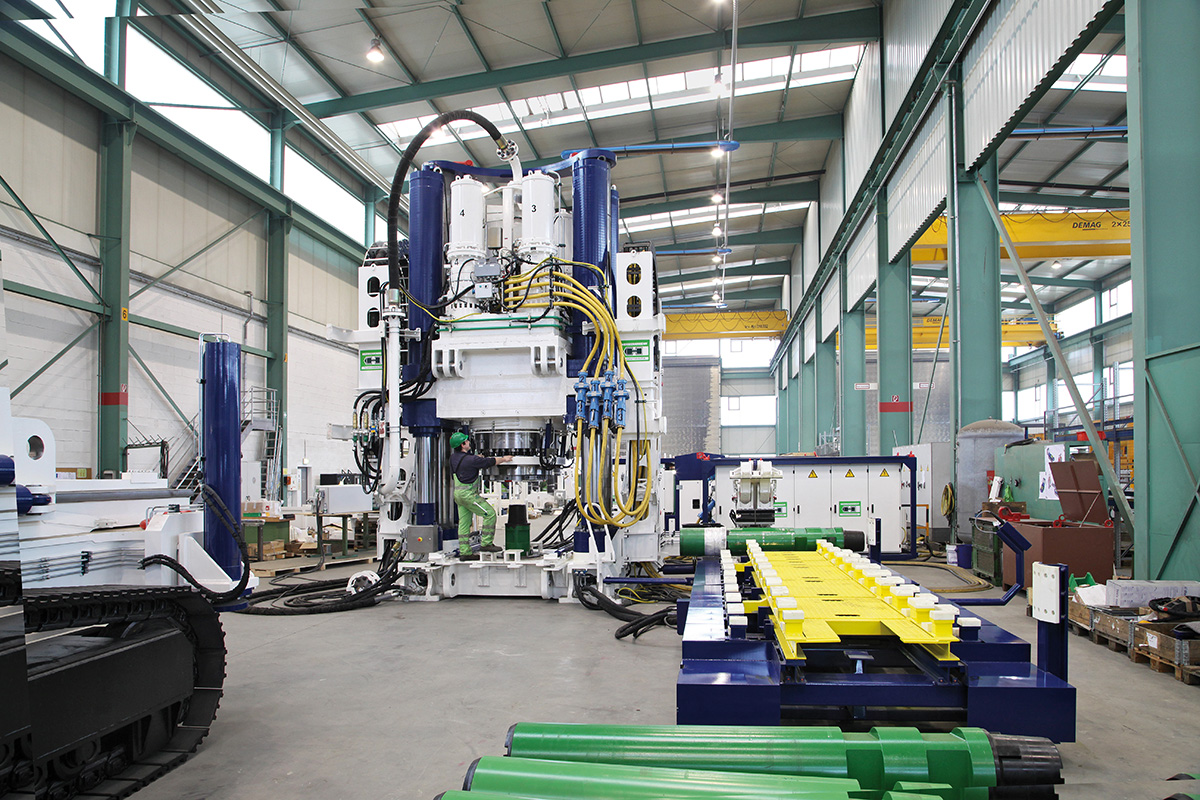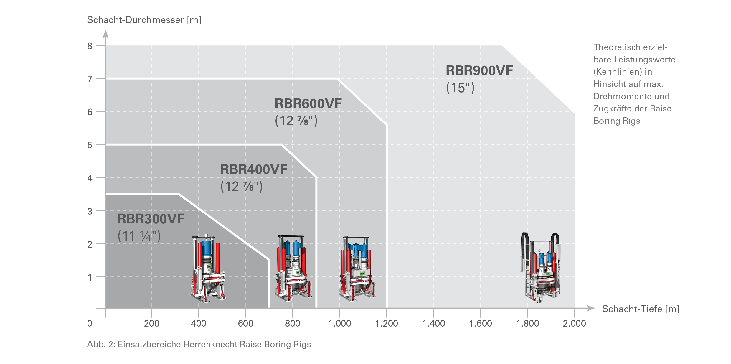 Um tiefe Schächte bis 2.000 Meter mit großen Durchmessern bis acht Meter abteufen zu können, bedarf es Rigs mit hohem Drehmoment und hohen Zugkräften. Auf diesen Bedarf zielt besonders das von Herrenknecht in Kooperation mit dem australischen Mining-Contractor Macmahon konzipierte Raise Boring Rig RBR900VF mit einem Drehmoment von 900 kNm (663.805 ft-lbf) und einer Zugkraft von 2.243 t (4.945.797 lbf) ab. Das RBR900VF ist das leistungsstärkste derzeit am Markt verfügbare Raise Boring Rig (Abb. 3).