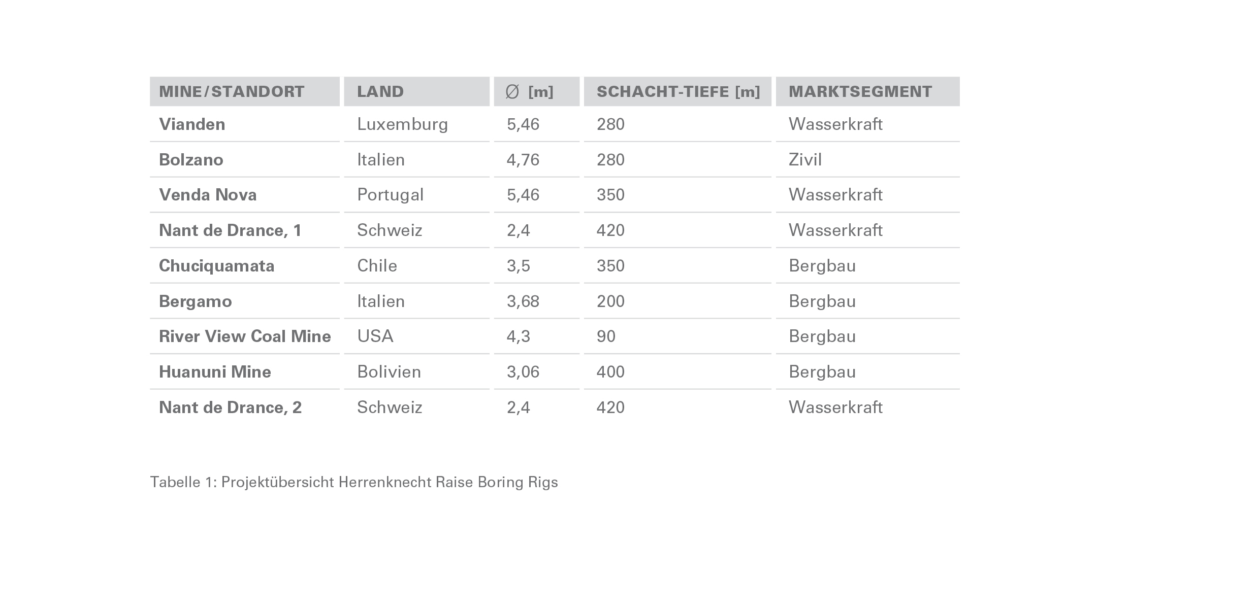 Die Raise Boring Rigs von Herrenknecht haben sich seit dem Ersteinsatz eines Prototypen im Jahr 2010 für das Wasserkraftwerk Vianden in Luxemburg [1] in einer Vielzahl von Projekten weltweit bewährt. Sowohl bei der Erstellung von Produktions- und Ventilationsschächten in Bergwerken (Kupfer, Kohle, Zinn) als auch in Infrastrukturprojekten (Druckschächte für Wasserkraftwerke, Ventilationsschächte für Straßentunnel) stellten sie ihre Leistungsfähigkeit unter Beweis (Tabelle 1: bisherige Projekte). Heute bietet Herrenknecht eine Produktpalette mit vier RBR-Typen an.