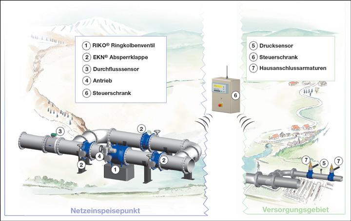 Am Einspeisepunkt des Versorgungsgebiets wird eine Regeleinrichtung (Ringkolbenventil) nebst Druck- und Durchflusssensor installiert. Eine speicherprogrammierbare Steuerung (SPS) erfasst, verarbeitet und archiviert die gemessenen Sensordaten, die zur Ansteuerung der Regelarmatur benötigt werden. Je nach Netztopographie und Wasserverbrauch werden unterschiedliche Stellungen der Regelarmatur angefahren, um den Versorgungsdruck im Netz auf ein Optimum zu reduzieren. Reduzierter Versorgungsdruck bedeutet nämlich immer eine Reduzierung der Wasserverluste. Positiver Nebeneffekt dabei: Ein reduzierter Versorgungsdruck vermindert die Entstehung von neuen Rohrbrüchen im Versorgungsnetz.