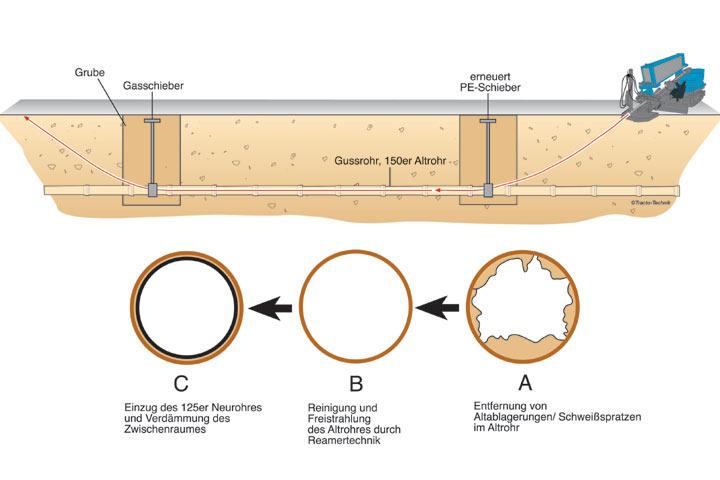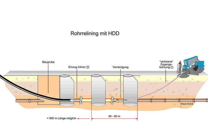 Verfahrensübersicht zum HDD-InnenrohrreliningMit HDD-Anlagen lassen sich in vorhandenen Leitungen, unter einer gewissen Querschnittsreduktion, neue Leitungen in alte bestehende Leitungen einziehen, um auf diese Weise neue Leitungen im Schutz der vorhandenen Leitungssubstanz, zu verlegen.
