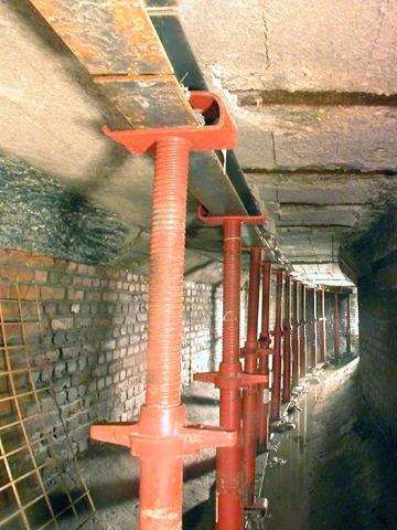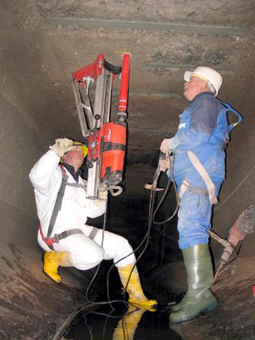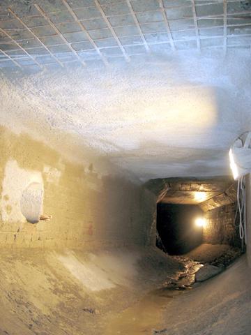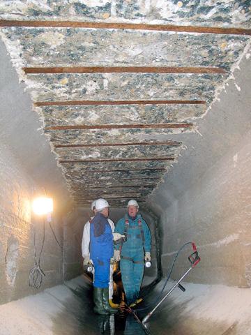 Anschließend befestigte man im gesamten gesamten Sanierungsbereich Anker und Längseisen an der Decke und im Bereich des Deckenauflagers. Diese wurden sowohl herkömmlich gebohrt als auch mit einem Spezialmaterial der Fa. Hilti geklebt. Die Verklebung sorgte für einen 100prozentigen Kraftschluss der Anker mit der Rohrwand über den gesamten Ringraum des Bohrprofils. An diesen Ankern und Längseisen wurden die neuen Bewehrungsmatten aufgehängt und schwingungsfrei verknüpft. Daraufhin erfolgte der Auftrag einer 13 Zentimeter starken Spritzbetonschicht nach DIN 18551 im Trockenspritzverfahren.