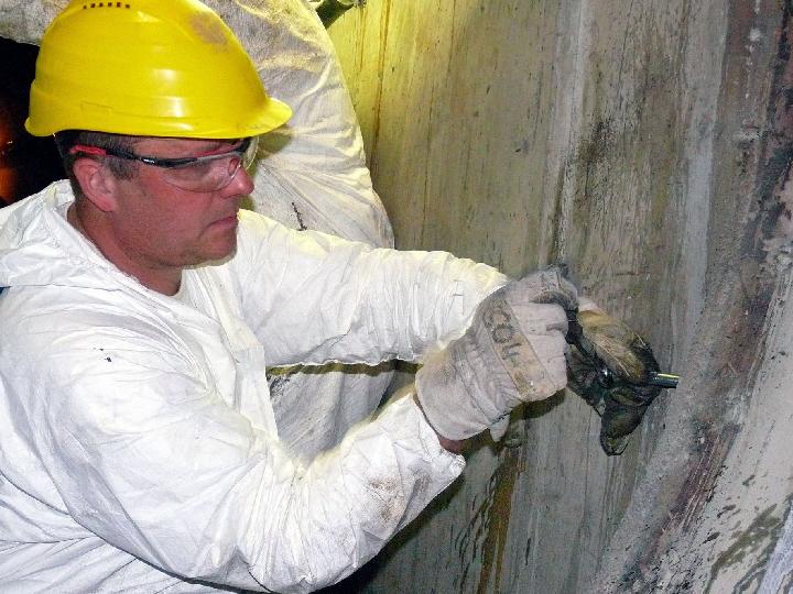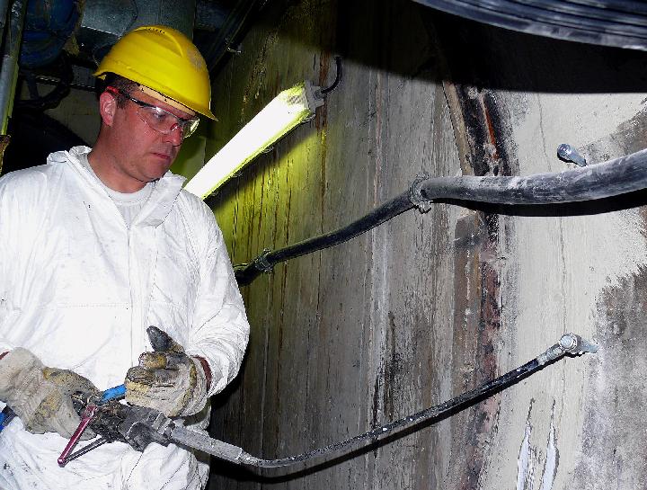 Für das SMG-Personal, das harte Arbeit aus dem Untergrund natürlich gewöhnt ist, stellte sich der Einsatz in dem Fernwärmeschacht dennoch als spezielle physische Belastung heraus. Um den nötigen Bewegungsspielraum für die Arbeit zu schaffen, hatte der Auftraggeber die Isolierung der Rücklaufrohre im Schacht demontiert. In der Folge stieg die Temperatur vor Ort auf über 40°C an und machte schon bloße Anwesenheit zu einer schweißtreibenden Angelegenheit, von schwerer Arbeit im Kunststoff-Schutzanzug ganz zu schweigen.
