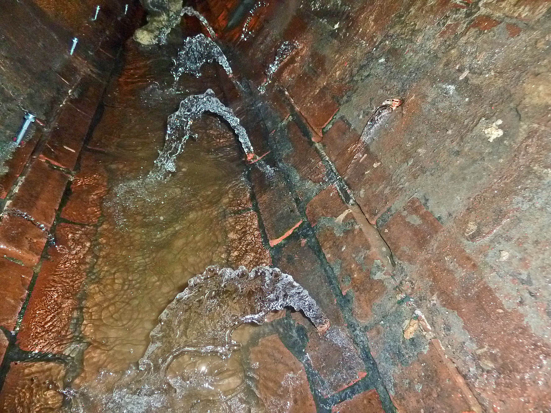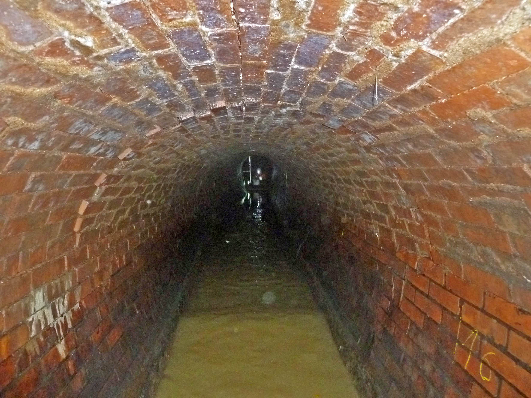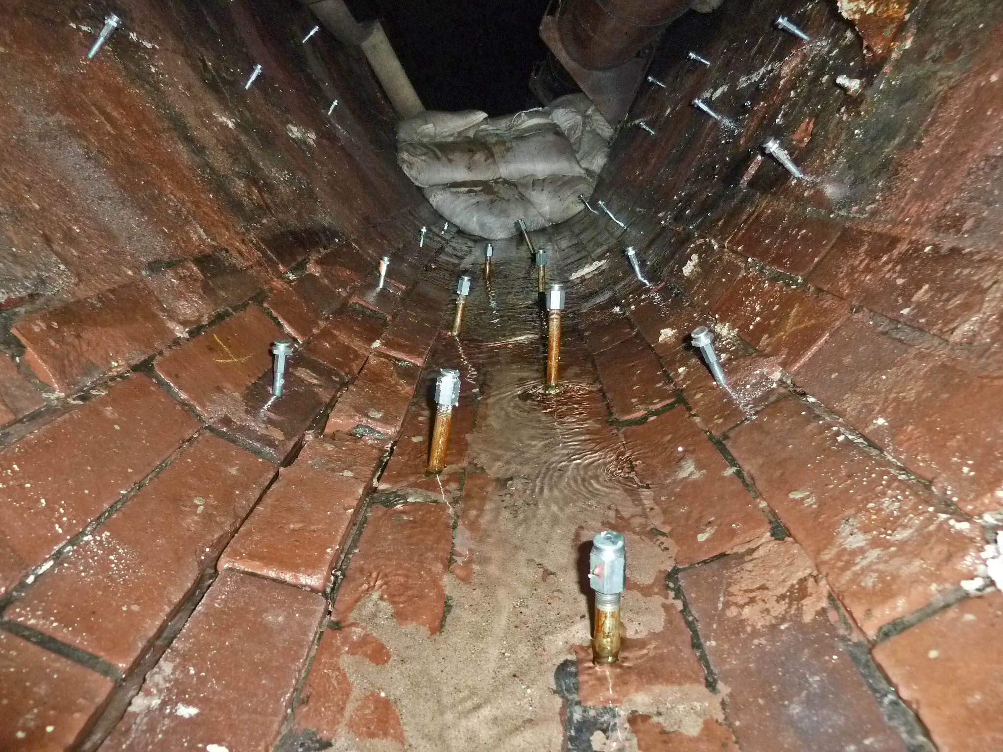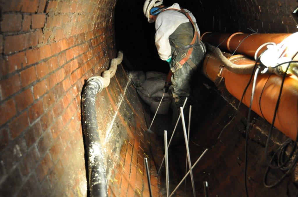 Risse oberhalb des Kämpfers wurden im folgenden Arbeitsgang mit Mörtel verpresst, um die Standsicherheit des Sammlers endgültig wieder her zu stellen. Nachdem der Wassereinbruch vollständig gestoppt und das Bauwerk erfolgreich trocken gelegt war, wendeten sich die Experten einem weiteren Problem zu: Der Sammler hatte im Bereich der Sohle einen markanten Unterbogen entwickelt, der sich günstiger Weise nicht im Scheitel des Bauwerks wieder fand. So konnte im letzten Arbeitsgang der Unterbogen mit Beton ausgeglichen werden, in den man eine Steinzeug-Gerinneschale zur Verbesserung der Hydraulik bettete.