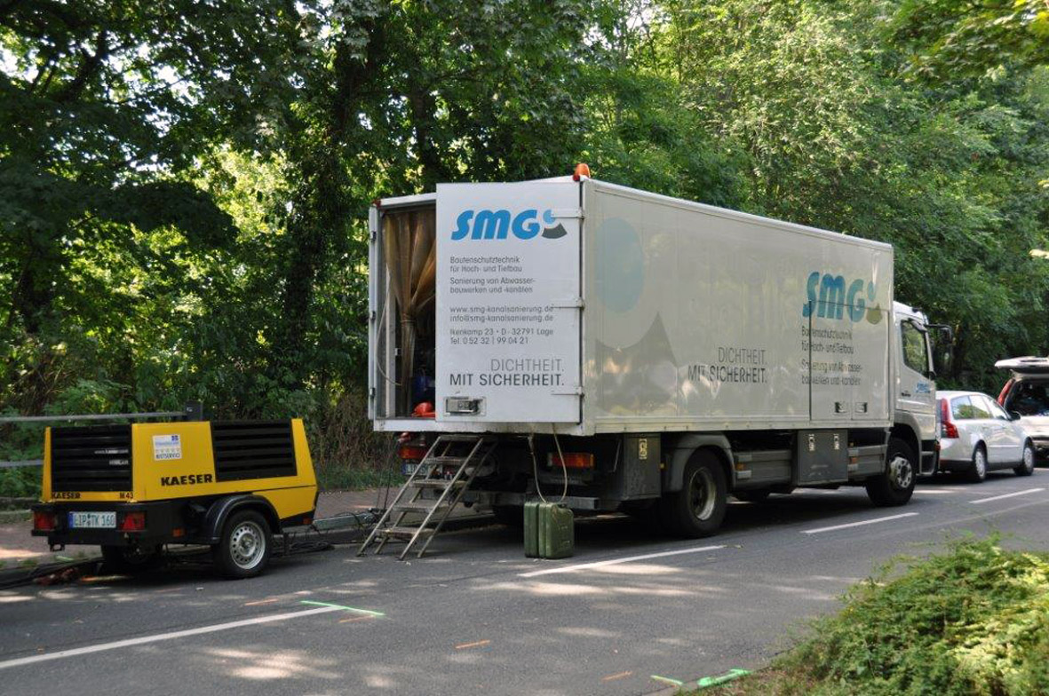 Bei der Entwicklung eines Sanierungskonzeptes für diese Schadstelle (in einem ansonsten weitestgehend schadensfreien Sammler) zogen die Planer der städtischen Betriebe Minden einen namhaften Experten zu Rate. Dipl.-Ing. Volker Schmidt aus Lage ist ein bundesweit bekannter Experte für die baulichen Probleme großer Abwasserbauwerke und wird mit seinem Unternehmen, der SMG Bautenschutztechnik für Hoch- und Tiefbau GmbH immer wieder gerufen, wenn und wo im Untergrund wirklich „haarige“ Probleme gelöst werden müssen – und in diese Kategorie gehörte der Mindener Bombenschaden auch nach Schmidts erster Einschätzung ohne Zweifel. An irgendein Standard-Verfahren der Kanalsanierung war hier gar nicht zu denken – an die offene Erneuerung der maroden Strecke jedoch ebenso wenig angesichts der Lage im Verkehrsraum.