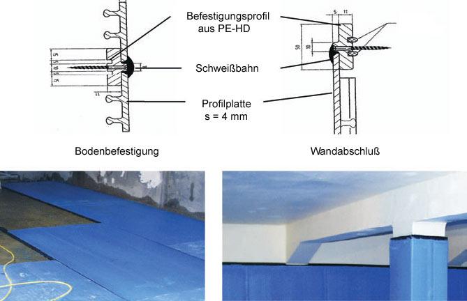 Die vom Auftragnehmer vorgeschlagene Unterdruckprüfung zum Nachweis der Dichtigkeit aller Verbindungen mittels Vakuumglocke wurde abgelehnt, da kein Schaummittel mit Trinkwasserzulassung verfügbar war. Die Dichtigkeitsprüfung aller Schweißnähte wurde mit der Funkendurchschlagmethode durchgeführt, was bei entsprechender Feuchtigkeit hinter der Auskleidung gut möglich ist. Dabei wurde eine undichte Schweißnaht (< 1 mm) detektiert, die in einem Bereich lag, in dem die Vakuummethode ohnehin nicht anwendbar gewesen wäre (Ecke). Eine Hinterfüllung mittels eines Tracers zur Dichtigkeitsprüfung wurde ebenfalls nicht durchgeführt, da die Hinterfüllungsmenge rund 20 m3 betragen hätte. Bei dieser Menge wäre die Neutralisation, etwa bei der Verwendung von Kaliumpermanganat als Tracer, zu aufwändig. Des Weiteren besteht bei einer Hinterfüllung mit einer ausreichenden Höhendifferenz gegenüber der Innenfüllung die Gefahr des Auftriebs und der Zerstörung der Sohlbefestigung der PE-HD-Platten.