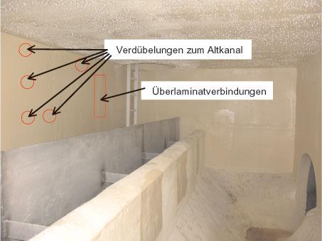 Besonderes Augenmerk ist schließlich auf den Sohlbereich zu richten, da er wegen der relativ flachen Bermen in Abhängigkeit von Grundwasserstand und Dämmerdruck zu einem Aufwölben (nach oben) neigt. Die Bodenkonstruktion muss, in Abhängigkeit von den Außendrücken, Wasser- bzw. Dämmerdruck) entweder ausreichend steif ausgeführt werden (große Wanddicke) oder besonders seitlich des Gerinnes mit Dübeln an die bestehende Sohle verankert werden.