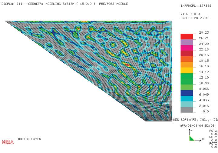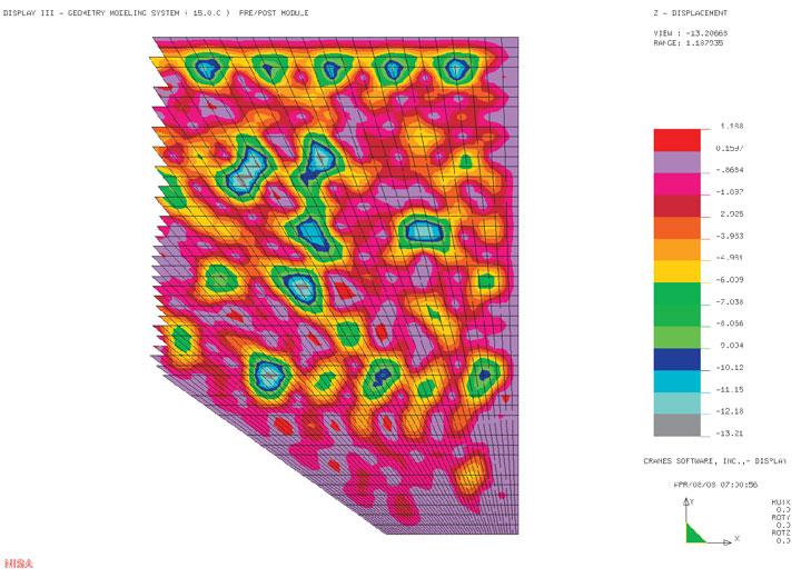 Die statische Nachweisführung hängt von der Schachtgeometrie, und den Materialkennwerten der eingesetzten GfK-Platten ab. Die GfK-Platten sind für die Einwirkung durch Wasseraußendruck statisch nachzuweisen. Bei kreisförmigen Schächten ist die Lastabtragung deutlich günstiger, da sie im Wesentlichen über die Ringnormalkraft in Umfangsrichtung erfolgt. Bei rechteckförmigen Querschnitten handelt es sich um ein reines Biegeproblem. Die erforderliche Wanddicke der Platten kann durch analytische Berechnungen oder durch FE-Berechnungen ermittelt werden. Bei der Auskleidung von ebenen Schachtflächen ist insbesondere auf die durch den Wasserdruck resultierenden Deformationen zu achten. Hierzu gibt es keinen normativen Grenz- oder Anhaltswert. Es wird daher empfohlen, einen derartigen Grenzwert vorab im Rahmen der Planung festzulegen, da die Plattenverformungen in Abhängigkeit von Dübelraster und Außendruck eine Größenordnung erreichen können, die nicht mehr akzeptabel ist (Matratzenmuster) obwohl die Tragfähigkeitsnachweise noch eingehalten sind. In Bild 7 ist die Diskretisierung einer Sohlauskleidung dargestellt. Bild 8 z. B. zeigt die Vertikaldeformationen dieses Schachtbodens mit einer Wanddicke von 3,0 mm und Anordnung eines Dübelrasters (Dübelabstand ≤ 15 cm) unter Einwirkung einer Wasseraußendruckbelastung von 5,0 m über Sohle. Es resultiert eine Verformung von immerhin 13,2 mm bei ausreichender Tragfähigkeit. Bild 9 zeigt die maximalen Hauptzugspannungen. Es ergibt sich ein Maximalwert von 28,23 N/mm². Gegenüber einer Langzeitfestigkeit von 60 N/mm² ist somit die erforderliche Scherheit von 2,0 eingehalten. Bei der Planung sollte auch berücksichtigt werden, ob die Wasseraußendrücke kurz- oder langzeitig anstehen, da die jeweils zugehörigen E-Module maßgeblich die Deformationen beinflussen. Im vorliegenden Fall wurde auf der Grundlage der durchgeführten statischen Berechnung eine minimale zulässige Dübelzugkraft von 2,0 kN vorgegeben. Die in der Zulassung angegebenen zulässigen Dübelkräfte sind statisch nachzuweisen. Dabei ist neben der Aufnahme der Ankerzugkräfte insbesondere auch auf die Gewährleistung der Auftriebssicherheit zu achten. Die Übertragung der Scherkräfte in die bestehende Schachtwandung muss abgesichert sein.
