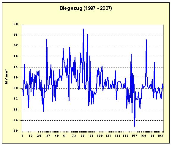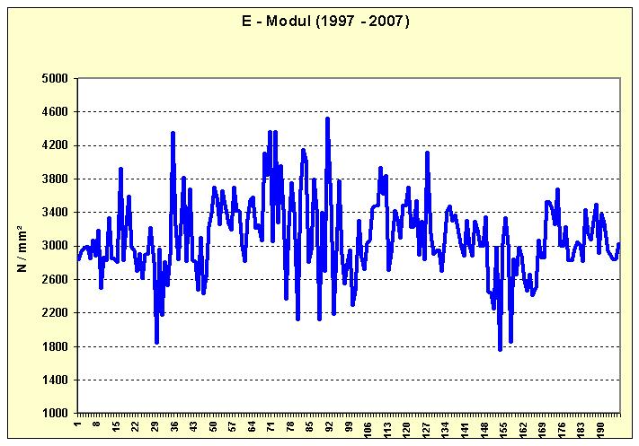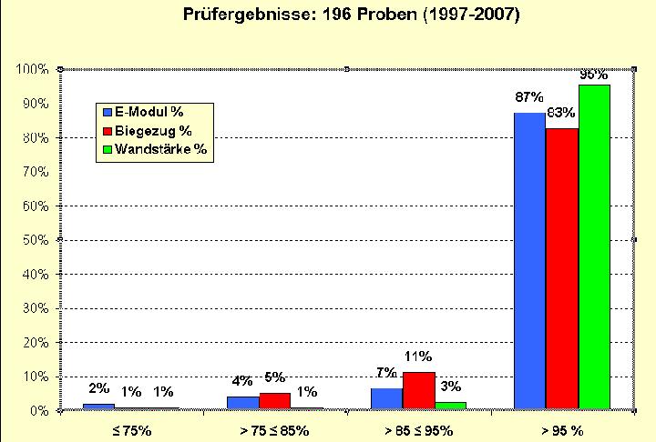 Tabelle 1: Prüfdaten Im Zeitraum zwischen 1998 und 2007 wurden insgesamt 196 Materialproben von den EntsorgungsBetrieben Solingen aus einem eingebauten Schlauchliner entnommen und in einem Institut für Materialprüfung untersucht. Während diesem Zeitraum wurden folgende Ergebnisse festgestellt: Siehe Grafik 4 und 5 sowie Tabelle 1.
