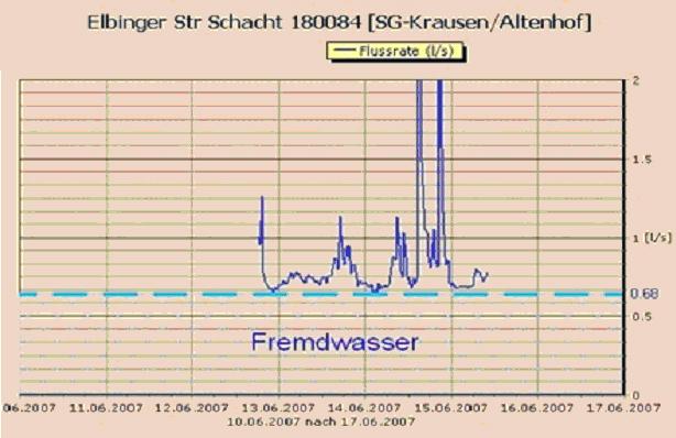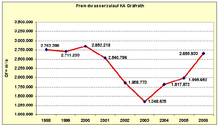 Fremdwasserproblematik Bis zum Jahr 2005 waren die EntsorgungsBetriebe Solingen überzeugt, mit ihrer Strategie einen guten und wirtschaftlichen Weg eingeschlagen zu haben. Man konnte davon ausgehen, dass bis zum Jahr 2015 das Kanalisationsnetz der Stadt Solingen dem Stand der Technik entsprechen würde. Die Fremdwassermessungen im Bereich der Kläranlage Solingen-Gräfrath haben dieses Bild jedoch völlig ins Wanken gebracht. Der Kläranlagenbetreiber Bergisch Rheinischer Wasserverband (BRW) und die EntsorgungsBetriebe Solingen haben im Jahr 1999 beschlossen, das vorhandene Klärwerk und das zugehörige Kanalisationsnetz gegen Fremdwasserinfiltration zu schützen. In den Jahren 2001 bis 2002 wurden entsprechende Sanierungsmaßnahmen durchgeführt. Das Fremdwasser konnte bis 2003 um 50 % reduziert werden. Ab 2003 ist das Fremdwasser jedoch wieder gekommen und hatte 2006 fast den alten Höchstwert wieder erreicht.