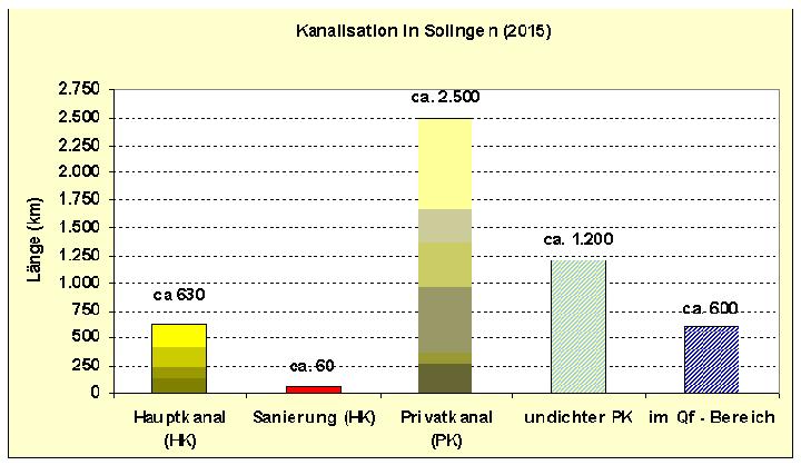 Seit 1997 wurde in 10 Entwässerungsgebieten die Sanierungsstrategie der EntsorgungsBetriebe Solingen angewendet (ca. 330 km).