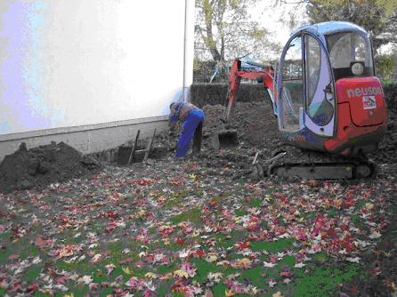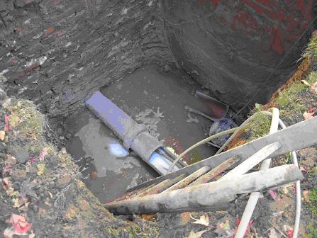 Zur Überprüfung der Rohrdichtheit wurde das vorhandene Grundleitungssystem unter der Kellersohle und zwischen den Gebäuden freigelegt. Ein Teilstrang der Grundleitung wurde dann durch die Anordnung von Abdichtungsblasen trocken gelegt und auf ihre Dichtheit überprüft. Die Anordnung der Probestrecke wurde so gewählt, dass der Abwasserrückstau in der Verbindungsleitung zwischen den Gebäuden stattfinden würde. Zum Setzen der Abdichtungsblase wurde in einer Baugrube vor dem Gebäude und unter der Kellersohle das Abwasserrohr aufgeschnitten.