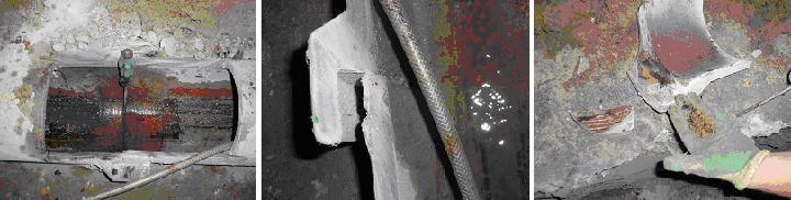 Dies bedeutet, dass nicht einmal 25 % des geforderten Mindestdruckes erreicht wurde. Nach der Druckprobe wurde das geprüfte Abwasserrohr im Bereich einer Rohrverbindung aufgeschnitten und auseinander gebaut. Die Überprüfung der Rohrverbindung zeigte, dass es keine Rohrdichtung mehr gab. Vereinzelt wurden Fragmente von einem damals verwendeten, in Teer getränkten Hanfband gefunden.