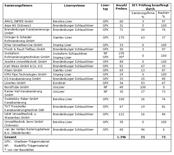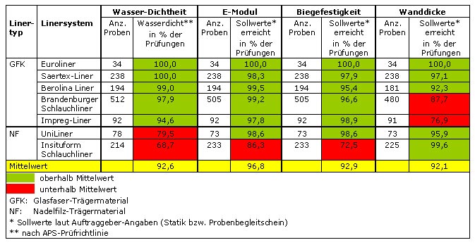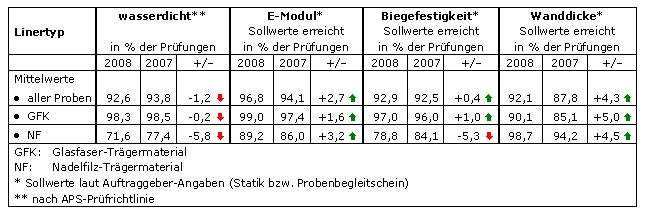 - Während GFK-Liner die Laborprüfungen bei den Kriterien Wasser-Dichtheit, E-Modul und Biegefestigkeit durchschnittlich in 97 bis 99% der Fälle bestehen, tun dies Nadelfilz-Liner nur zu 72, 89 und 79 Prozent respektive.