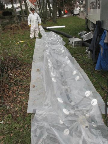 Der Einziehvorgang erforderte bei immerhin 2,8 Tonnen "Lebendgewicht" des markant grünen Liners einige Muskelarbeit der Erles-Mitarbeiter, die den Schlauch längs falten mußten, damit er sich durch den Schachtkonus hindurch einziehen ließ. Binnen einer Stunde lag er jedoch in ganzer Länge im Mischwassersammler und wurde beiderseits mit Hilfe von Drucktöpfen abgesperrt. Die Absperrkörper für diese Nennweite werden mit wenigen Handgriffen aus Einzelteilen im Untergrund montiert und gehören zur Standardausstattung des ErwoTec-Sanierungsfahrzeugs.