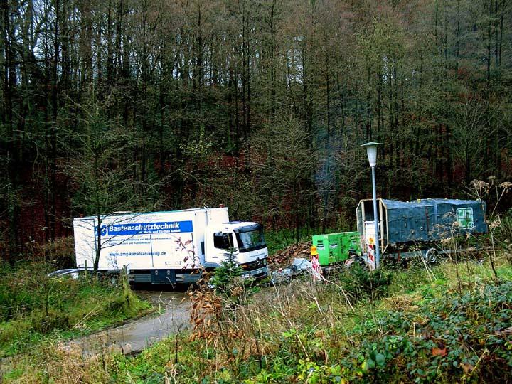 Dies alles geschah unter Randbedingungen, die auch die SMG-Sanierer bislang eher selten zu sehen bekommen haben. Fast alle Schächte standen in tiefem Morast, viele buchstäblich im Wasser, das nicht selten erkennbar anstieg, nachdem der Schacht abgedichtet war. Dies bewies nicht nur den Sanierungserfolg, sondern enthüllte zugleich, dass in ferner Vergangenheit offensichtlich einige Grundwasserquellen regelrecht ins Schmutzwassernetz "integriert" worden waren, die nun künftig wieder außerhalb des Schachtes sprudeln. Nicht nur die Arbeit in den sehr beengten Schächten war mühselig, sondern häufig schon der Weg dorthin und die Baustellenlogistik. Jeder einzelne Sack Zement und jedes Rohr für die Wasserhaltung musste über teilweise erhebliche Distanzen und durch unwegsames Gelände "zu Fuß" an den Einsatzort getragen werden.