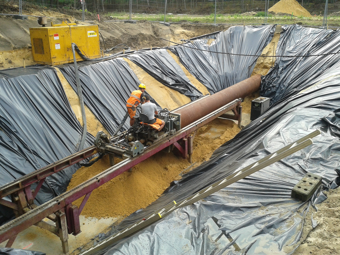 Die Erdarbeiten erwiesen sich bei diesem Projekt als relativ unspektakulär, da sich die Baugruben für die Bohrstrecken und die rohrleitungstechnischen Einbauten (Knotenpunkte, Be- und Entlüftungsventile) hauptsächlich im unbefestigten Gelände befanden. Unter Berücksichtigung der Lageabweichungen an den Bohrenden wurden jedoch Baugrubenlängen bis zu 40 m erforderlich.