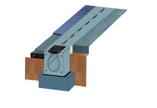 Schlitzrinnen zeichnen sich gegenüber anderen Rinnentypen dadurch aus, dass sie keine durchgängig aufmontierten Gitterabdeckungen tragen und folglich die verschleißanfällige Materialverbindung zwischen Rinne und Abdeckung entfällt. Lediglich an einem Ende der Rinnenelemente kann sich eine kleine Reinigungs- und Inspektionsöffnung befinden, die eine schwerlastbefahrbare Abdeckung trägt. Schlitzrinnen werden nach aktuellem Produktionsstandard aus stahlbewehrtem Beton vollständig in einem Stück gegossen. Sie sind somit frei von korrosionsanfälligen Nähten und Fugen. Gleichzeitig bedingt die monolithische Herstellungsweise, dass die Rinnen insbesondere dynamischen Horizontalkräften problemlos Stand halten.