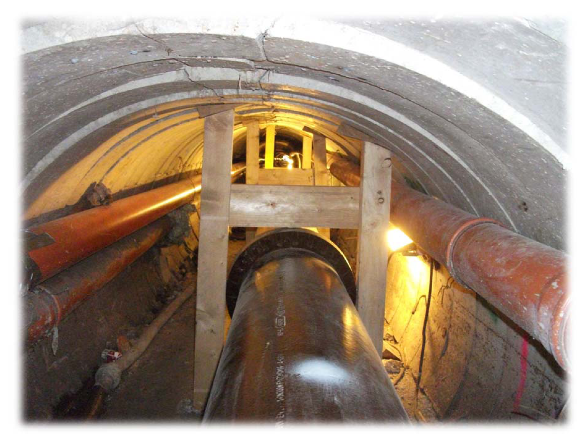 Nach Fertigstellung des Stollens werden die Produktrohre eingebaut und danach der Stollen verdämmt.