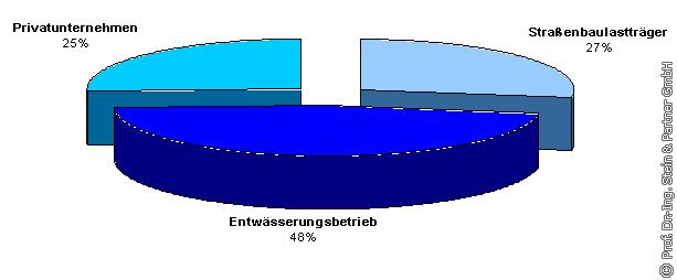 In 48% der Fälle wird die Reinigung der Straßenabläufe durch den Entwässerungsbetrieb der jeweiligen Kommune, in 27% durch den Straßenbaulastträger selbst und in 25% durch Privatunternehmen durchgeführt (s. Bild 3).