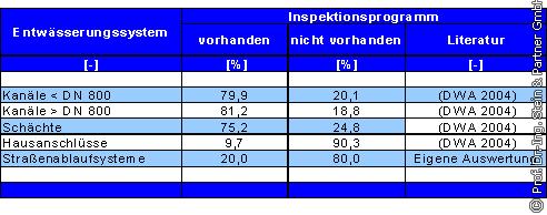 Anders sieht es dagegen bei der öffentlichen Kanalisation, den Abwasserkanälen und den Schächten aus. Hier werden laut DWA [4] bei ca. 80% der Kommunen Inspektionen, d.h. Istzustandserfassungen, durchgeführt. Der Istzustand von Hausanschlüssen hingegen wird nur in 9,7% der Kommunen erfasst. Letzteres ist hauptsächlich darauf zurückzuführen, dass sich diese Leitungen im Privatbesitz befinden und in der Regel nicht von den Kommunen betrieben werden (s. Tabelle 1).