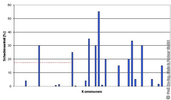 3.1.5 Anzahl schadhafter Straßenabläufe Bild 12 und Bild 13 zeigen die Verteilung der schadhaften Straßenabläufe SB bzw. SS. Bei dieser Frage konnten 32% der Kommunen keine Angaben zur Anzahl schadhafter Straßenabläufe machen. Bei den restlichen Kommunen ergab sich ein gemitteltes Schadenspotenzial von 13% beim Straßenablauf SB und 17% beim Straßenablauf SS. Dabei ist die Streuung der Schadensanzahl sehr weit gefächert. Sie reicht von < 1% bis zu einem Anteil von 55%. Diese Angaben basieren nicht auf Ergebnissen durchgeführter Inspektionen, sondern auf einer subjektiven Einschätzung der Netzbetreiber. Werden ausschließlich die Angaben der Netzbetreiber berücksichtigt, die ihre Straßenabläufe zumindest stichpunktartig inspiziert haben, weisen diese ein Schadenspotenzial zwischen 40% und 55% auf.