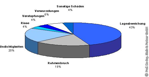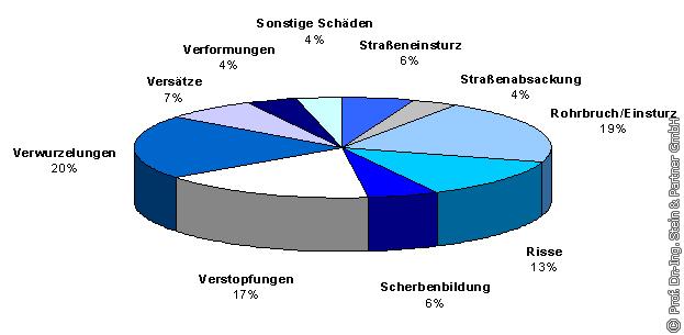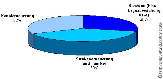 Hauptanlässe für die Einleitung von Sanierungsmaßnahmen am Anschlusskanal sind Wurzeleinwüchse (20%) und Verstopfungen (17%) sowie Rohrbrüche bzw. Einstürze der Rohre (19%) (s. Bild 15). In diesen Fällen besteht sofortiger Handlungsbedarf (Feuerwehrstrategie), um die Funktionsfähigkeit des jeweiligen Straßenablaufsystems wieder herzustellen und ggf. Folgeschäden an der Fahrbahn zu beseitigen.