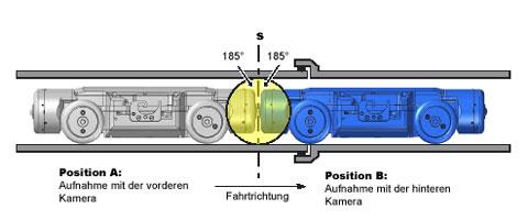 Der wesentliche Unterschied gegenüber herkömmlichen Kanal-TV-Schwenkkopfkameras besteht bei PANORAMO in der kompakteren, zylinderförmigen Bauweise und der Anordnung von zwei unbeweglichen Digitalkameras auf der Vorder- und Rückseite des Fahrwagens mit einer Auflösung von 1392 x 1040 Pixel = 1,44 Megapixel (Bild 2 b). Bei den Objektiven handelt es sich um Weitwinkelobjektive (spezielle Fischaugenlinsen), welche einen halbkugelförmigen Vorwärts- und Zurückblick von je 185 ° gestatten (Bild 1). Die PANORAMO-Scannersoftware sieht zwei mögliche Betriebsarten für die Bildaufnahme vor [7]: