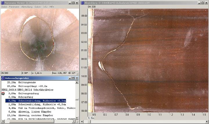 Hinweise zum Thema der Erkennbarkeit von Rissen unter Praxisbedingungen liefert z.B. ein Bericht der Berliner Wasserbetriebe, bei denen Parallelinspektionen mit einer konventionellen Dreh-/Schwenkkopfkamera mit 10-fach-Zoom-Objektiv und PANORAMO aufgenommen wurden [10].