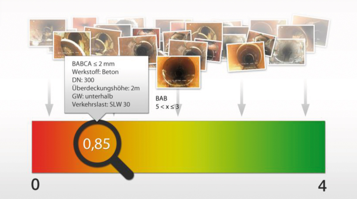 Im Rahmen der Zustandsbewertung wurden die Ergebnisse der Zustandsklassifizierung mit maßgeblichen Einflussfaktoren bzw. leitungsspezifischen Randbedingungen im Umfeld des Einzelschadens verknüpft. Ihre Berücksichtigung erlaubt, das Ergebnis der Zustandsklassifizierung nicht nur in Bezug ihrer Auswirkungen auf die Schutzziele besser zu differenzieren, sondern insbesondere auch eine bessere Abschätzung des Gefährdungspotenzials des Einzelzustands zu ermöglichen [5].