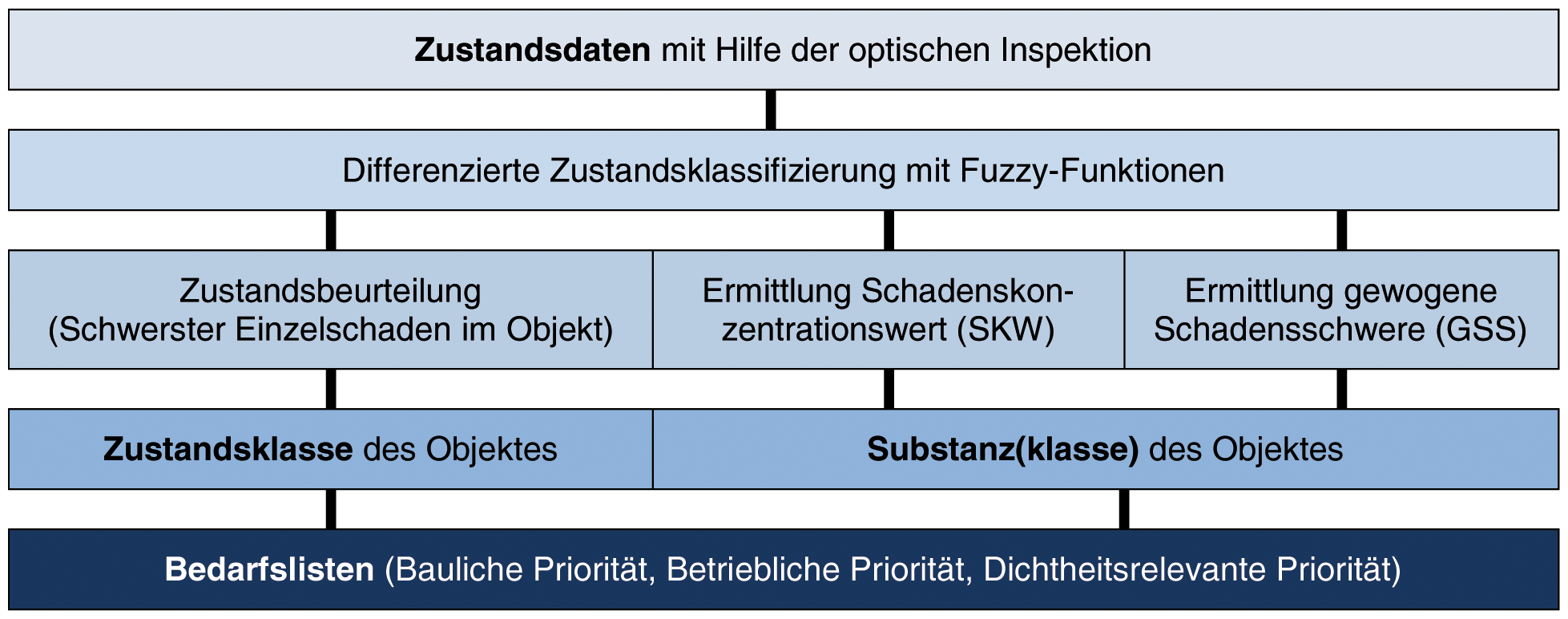 Durch diese Vorgehensweise wurde eine - gegenüber der diskreten Bewertung - differenziertere Rangreihung der ermittelten Zustands- und Substanzklassen ermöglicht und das Risiko minimiert, Haltungen mit unterschiedlichen Sanierungsdringlichkeiten pauschal zusammenzufassen (Abbildung 1).